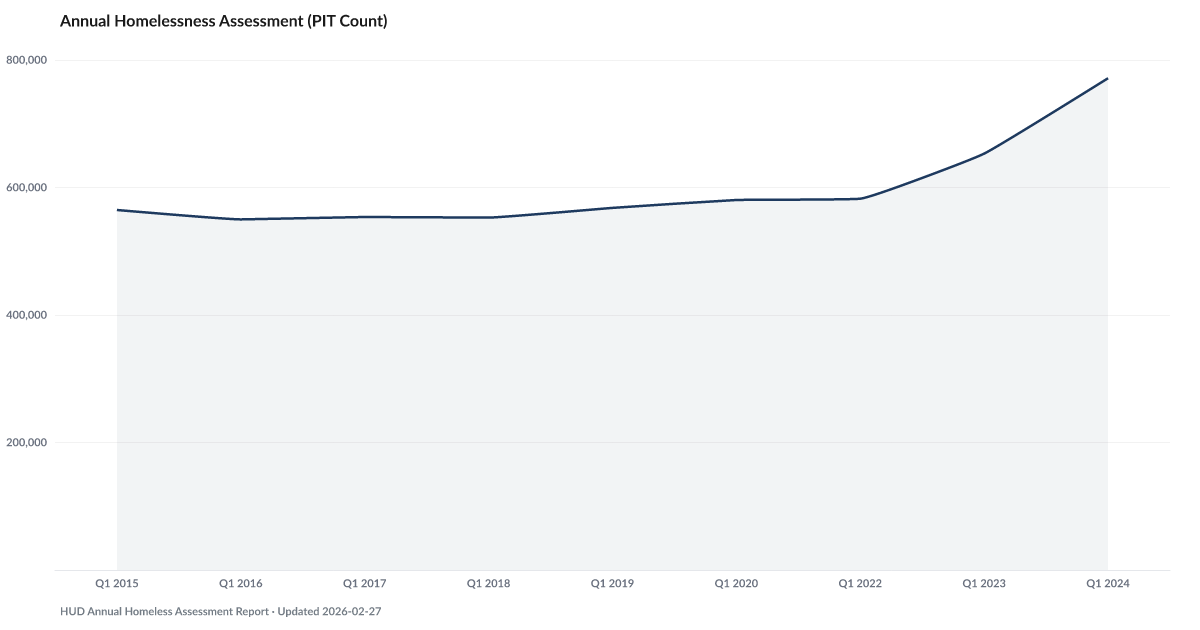 771,480 people were experiencing homelessness on a single night in January 2024, according to HUD's Annual Homelessness Assessment Report — the highest count ever recorded. This was up from 653,000 the prior year, and the count has climbed every year for five consecutive years. The point-in-time methodology significantly understates the total number of people who experience homelessness over the course of a full year. Source: HUD Annual Homelessness Assessment (PIT Count).