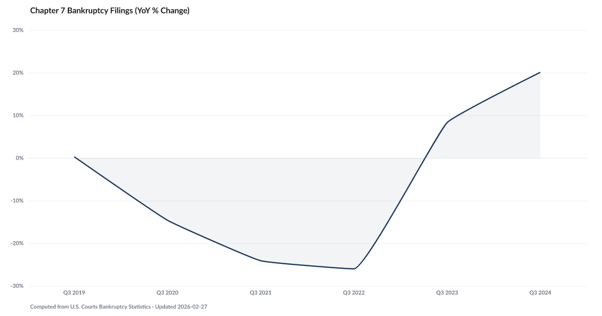 Chapter 7 bankruptcy filings increased 20.1% year-over-year in the latest data, indicating accelerating financial distress among households with no ability to repay debts.