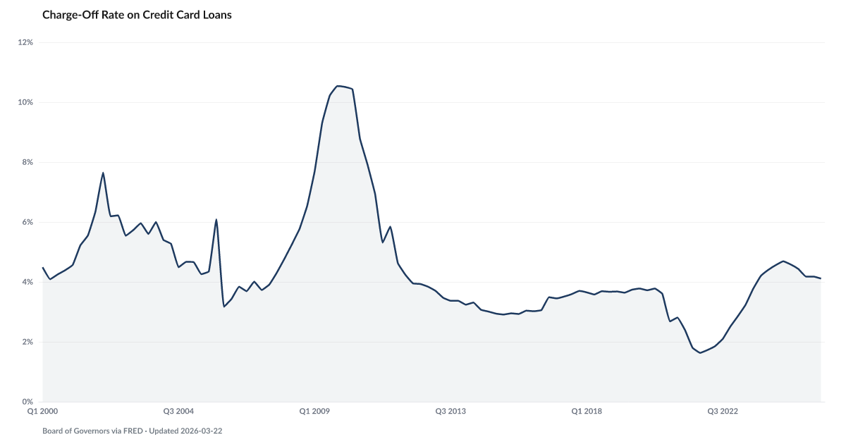 The credit card charge-off rate — the share of credit card balances that banks have written off as uncollectable — measures the terminal stage of credit card distress. When banks charge off a balance, they have concluded that the borrower will not repay and have absorbed the loss. Source: Federal Reserve Call Reports.