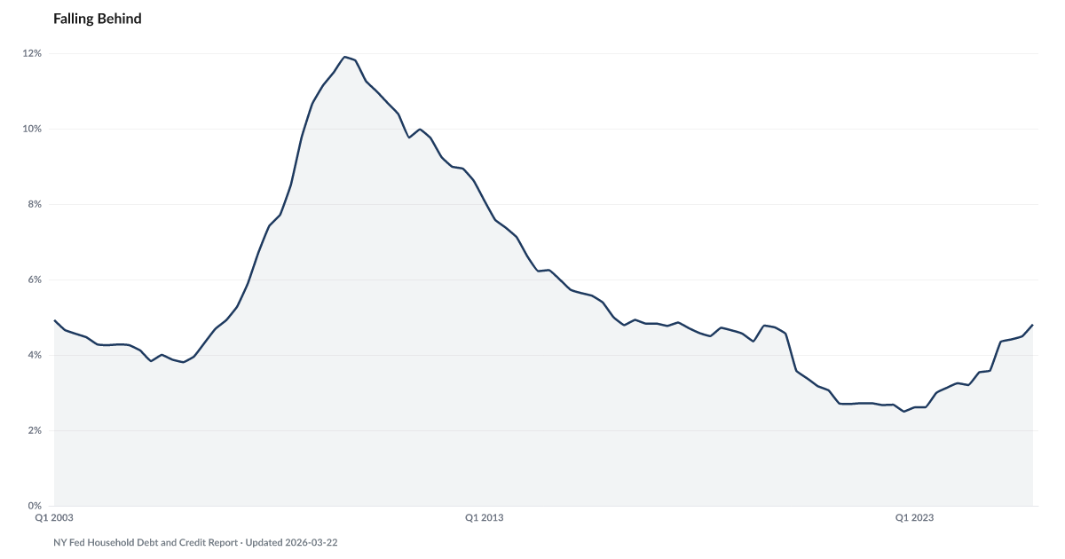 The total delinquency rate across all consumer loan balances was 4.8% in Q4 2025, according to the New York Fed. This includes mortgages, credit cards, auto loans, and student loans combined. It is the highest level since 2020.