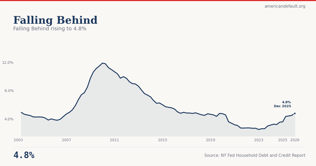 The current 4.8% total delinquency rate is well below the crisis peak levels of 2008–2010. However, the rate has been climbing steadily for three years from a pandemic-era floor, and the direction of the trend — rather than the absolute level — is what the American Distress Index monitors as a warning signal.