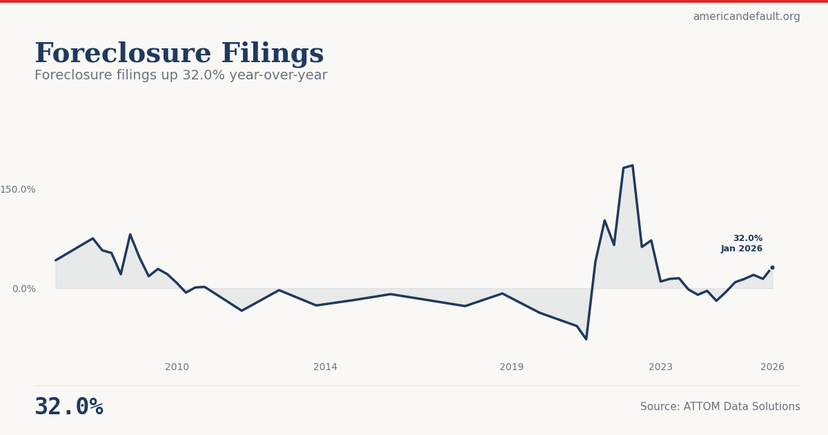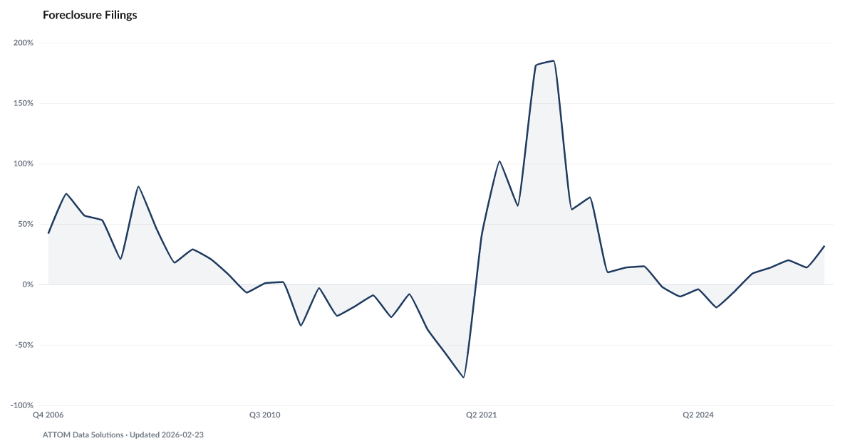 Foreclosure filings rose 32% year-over-year in Q1 2026, according to ATTOM Data Solutions. This follows three consecutive quarters of rising filings, marking a clear trend reversal from the pandemic-era suppression that pushed foreclosure activity to near zero.