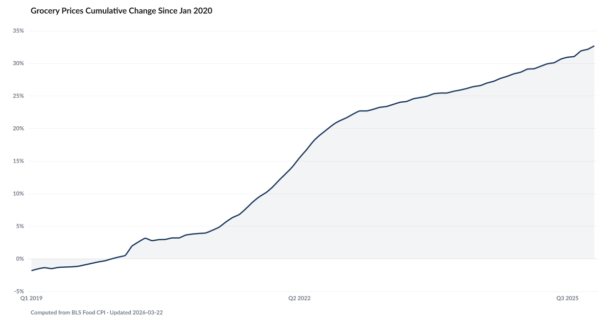 Grocery Prices Cumulative Change Since Jan 2020 rising to 32.1%
