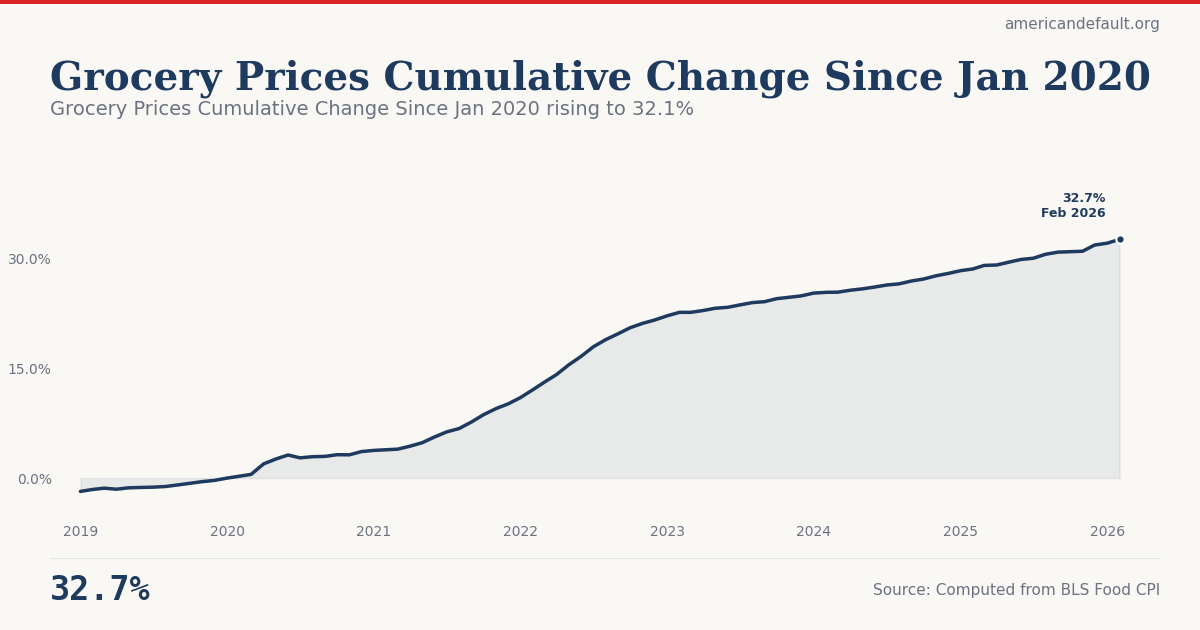 The Bureau of Labor Statistics publishes the Consumer Price Index for food at home monthly, measuring average price changes across a basket of grocery items. American Default computes the cumulative change from January 2020 as a baseline.