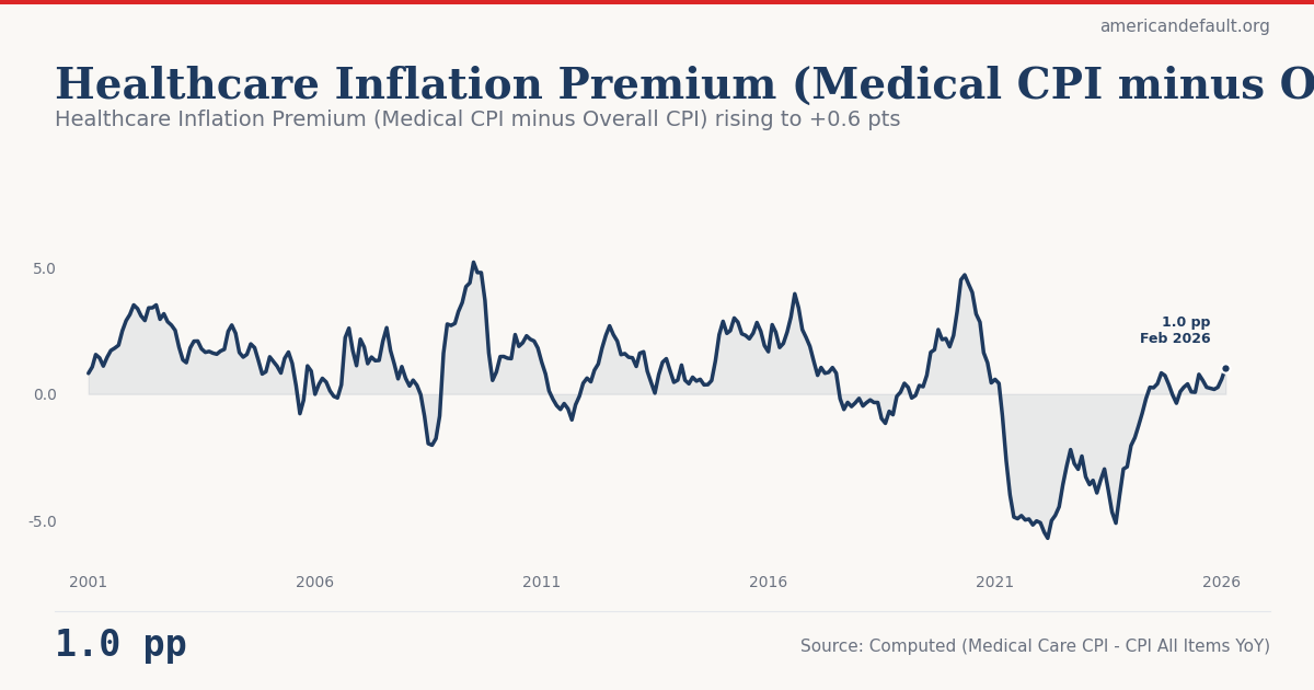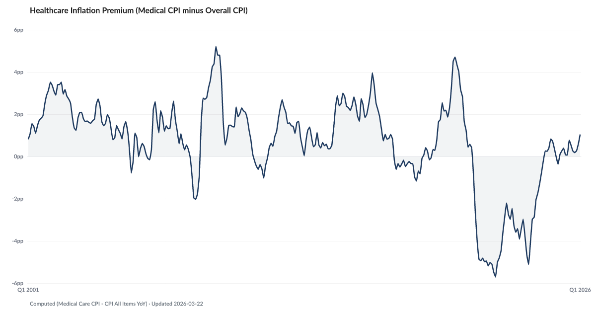 Healthcare inflation is running 1.04 percentage points above overall CPI in the latest reading. This premium — the gap between medical care CPI and all-items CPI — measures how much faster healthcare costs are rising compared to general prices. A persistent premium means healthcare is steadily consuming a larger share of household budgets. Source: BLS (CUSR0000SAM minus CPIAUCSL).
