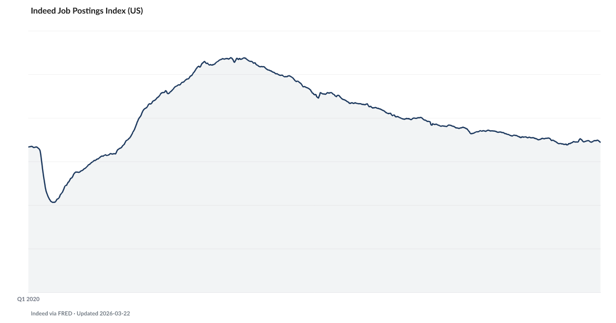 Published by Indeed Hiring Lab, available via FRED series IHLIDXUS. Updated daily with a 7-day moving average.