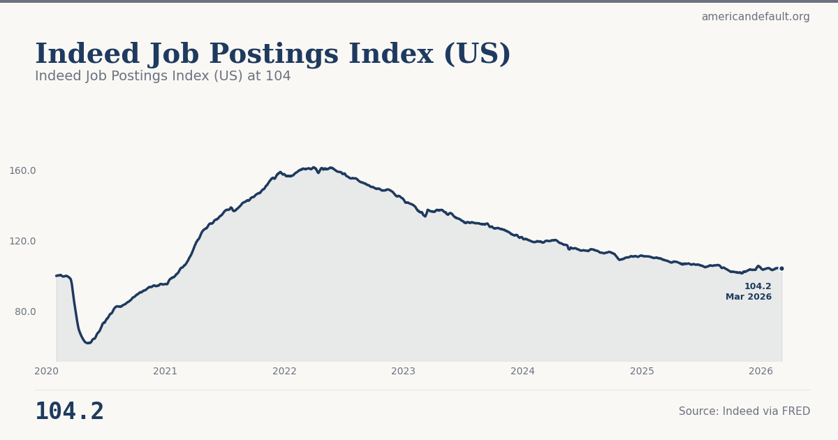 The Indeed Job Postings Index for the U.S. stood at 104.2 in the latest reading, normalized to a pre-pandemic baseline of 100 (February 1, 2020). This real-time measure of labor demand captures employer hiring intent faster than government surveys. Declining postings signal weakening demand for workers. Source: Indeed via FRED (IHLIDXUS).