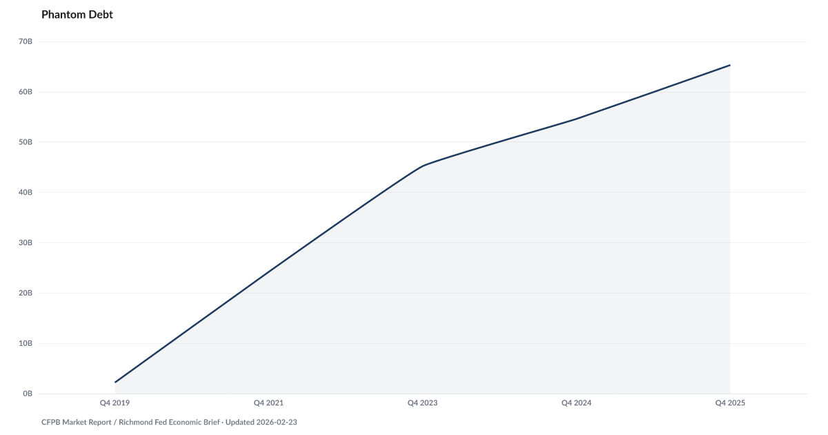Buy Now Pay Later originations among the six largest lenders reached an estimated $65.3 billion in 2025, according to Richmond Fed projections based on CFPB data. That's nearly 30 times the $2.2 billion originated in 2019. The growth is extraordinary. What makes it different from other forms of consumer credit is that most BNPL pay-in-four loans remain invisible to credit bureaus, meaning traditional measures of household debt systematically undercount what families actually owe.