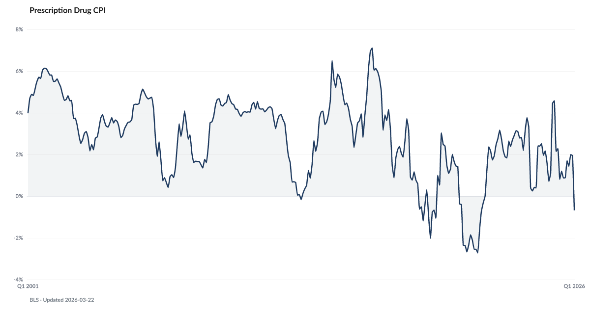 The prescription drug Consumer Price Index declined 0.68% year-over-year in the latest reading, one of the few consumer categories showing deflation. However, out-of-pocket drug costs remain a significant burden for uninsured and underinsured households who pay list prices rather than negotiated rates. Source: BLS (CUSR0000SEMF01).