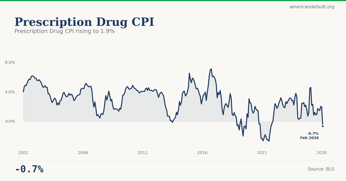 The BLS prescription drug CPI declined 0.68% year-over-year. However, this reflects negotiated prices — many consumers without insurance or with high-deductible plans still face rising out-of-pocket costs.