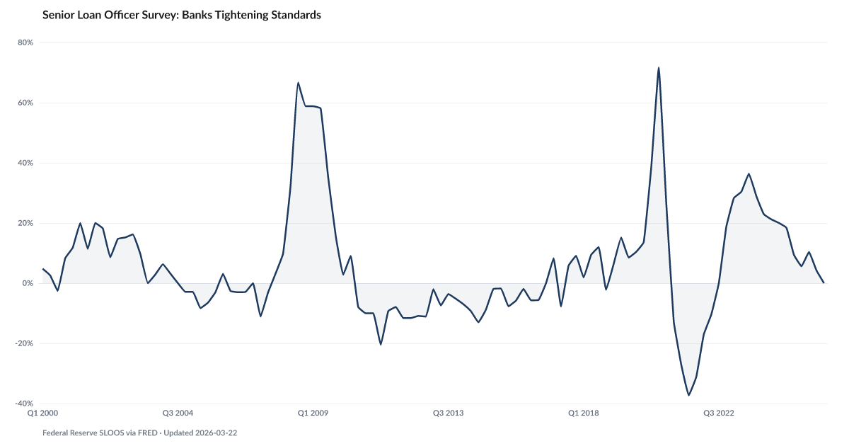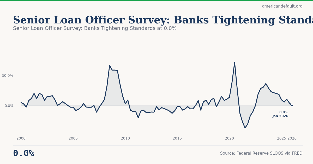The Senior Loan Officer Opinion Survey (SLOOS) measures whether banks are making it easier or harder to get loans. A positive reading means banks are tightening standards, making credit harder to access; a negative reading means they are loosening. This captures the supply side of credit — even if demand exists, tightening standards can cut off borrowers and amplify financial distress. Source: Federal Reserve SLOOS (quarterly).