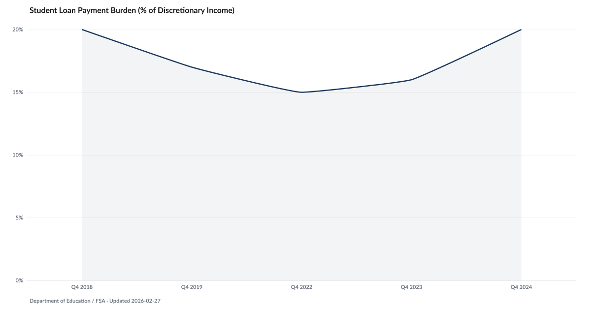 Student loan borrowers spend approximately 20% of their discretionary income on loan payments. For many borrowers — particularly those with graduate school debt or those earning modest incomes — this effectively eliminates the ability to save, invest, or build a financial cushion.