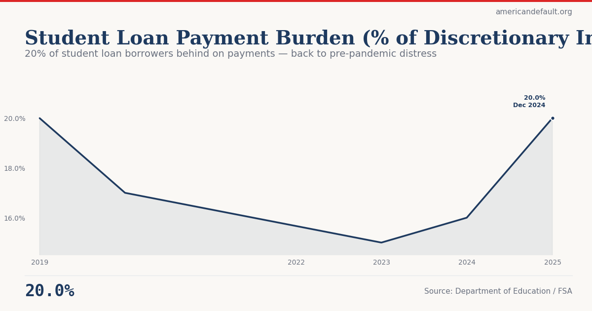 Student loan borrowers are spending approximately 20% of their discretionary income on loan payments — one of every five dollars earned after taxes and necessities goes to student debt service. This burden increased sharply after the expiration of the pandemic-era payment pause, which had temporarily reduced required payments to zero for federal borrowers. Source: Federal Reserve / BLS analysis.
