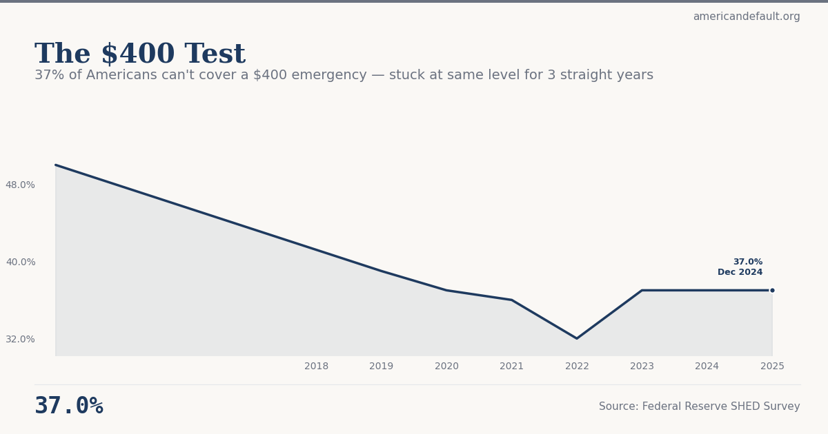 The Fed's Survey of Household Economics and Decisionmaking, fielded in October 2024 and published in May 2025, found that 37% of American adults could not cover a $400 emergency expense using cash or its equivalent. That figure has been essentially unchanged — 37% — for three consecutive years, after briefly falling to 32% in 2021 when stimulus payments temporarily rebuilt household reserves.