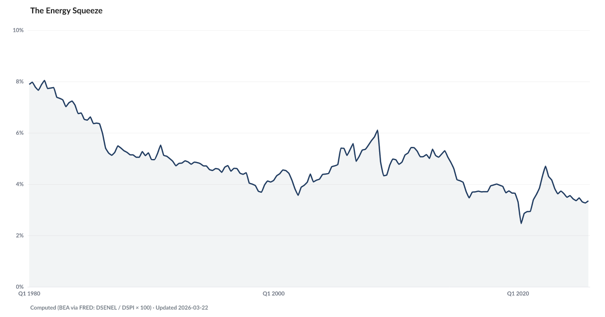 The Energy Squeeze tracks household energy costs as a percentage of total spending, currently 3.35%. It captures utility bills and fuel costs as a share of the household budget.