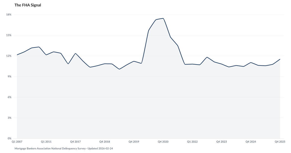 FHA delinquency rates hit 11.52% in Q4 2025, according to the Mortgage Bankers Association — nearly 6.5 times the 1.78% conventional rate and the highest level since 2021. FHA loans serve first-time buyers with thin financial cushions, making FHA delinquency a leading indicator of broader mortgage distress. The 9.74-point spread between FHA and conventional delinquency is historically unusual and signals stress concentrated among the most vulnerable borrowers. Source: MBA National Delinquency Survey (Q4 2025).