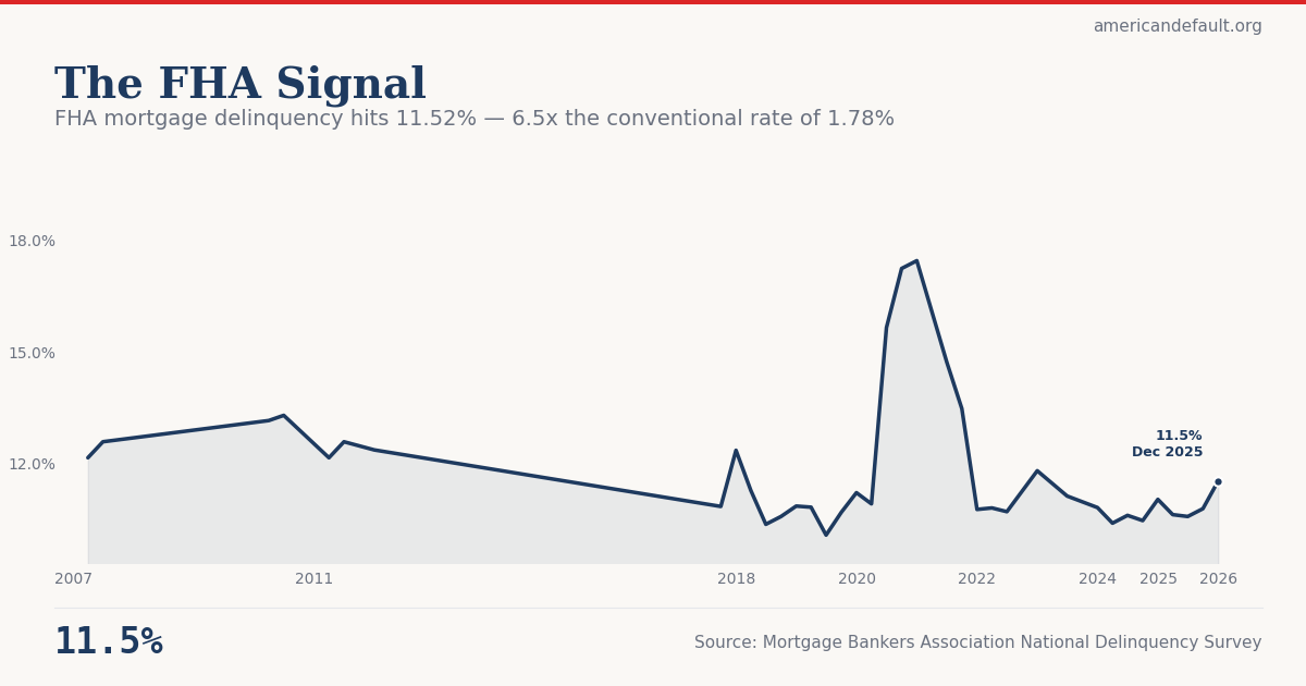FHA loans represent roughly 17% of the outstanding mortgage market by count but account for a disproportionate share of delinquencies. When the MBA reports its blended national delinquency rate (currently 4.26%), FHA's 11.52% is averaged down by conventional's 1.78%. This blended number obscures a two-tier market. For policymakers and researchers, FHA delinquency functions as a stress test of the most financially vulnerable homeowners. If FHA borrowers are struggling, the households below them on the income distribution — renters, subprime cardholders, auto loan borrowers — are likely struggling more. The American Distress Index uses FHA delinquency as supporting evidence for the Debt Stress component precisely because it captures distress that blended national statistics hide.