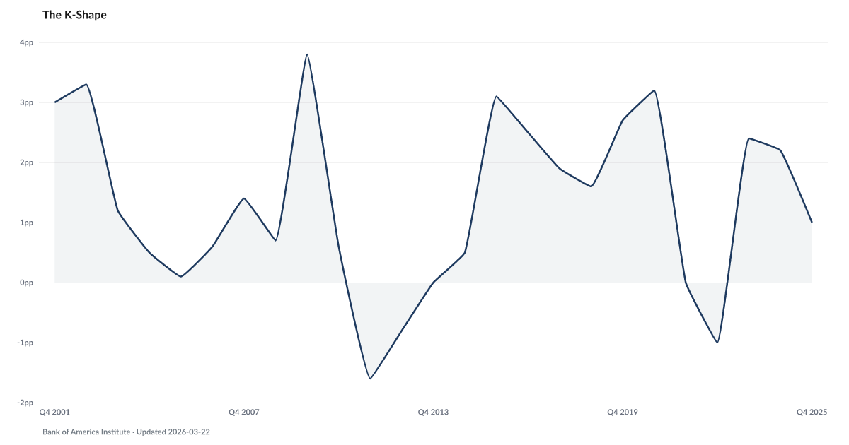 The K-shaped pattern was initially described as a temporary post-pandemic phenomenon expected to resolve as the labor market tightened. Five years later, the divergence has become structural, with the gap widening to levels not seen since 2016.