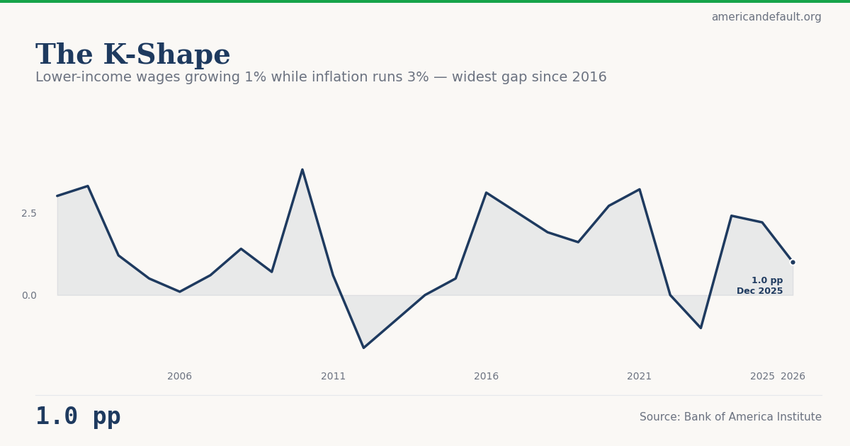 Lower-income households saw after-tax wage growth of just 1% year-over-year in late 2025, according to Bank of America Institute analysis of internal depositor data. With CPI inflation running at approximately 3%, lower-income workers experienced a real wage decline of roughly 2 percentage points. Higher-income workers, by contrast, saw 4% wage growth — comfortably ahead of inflation. The gap between the two groups is the widest since 2016.