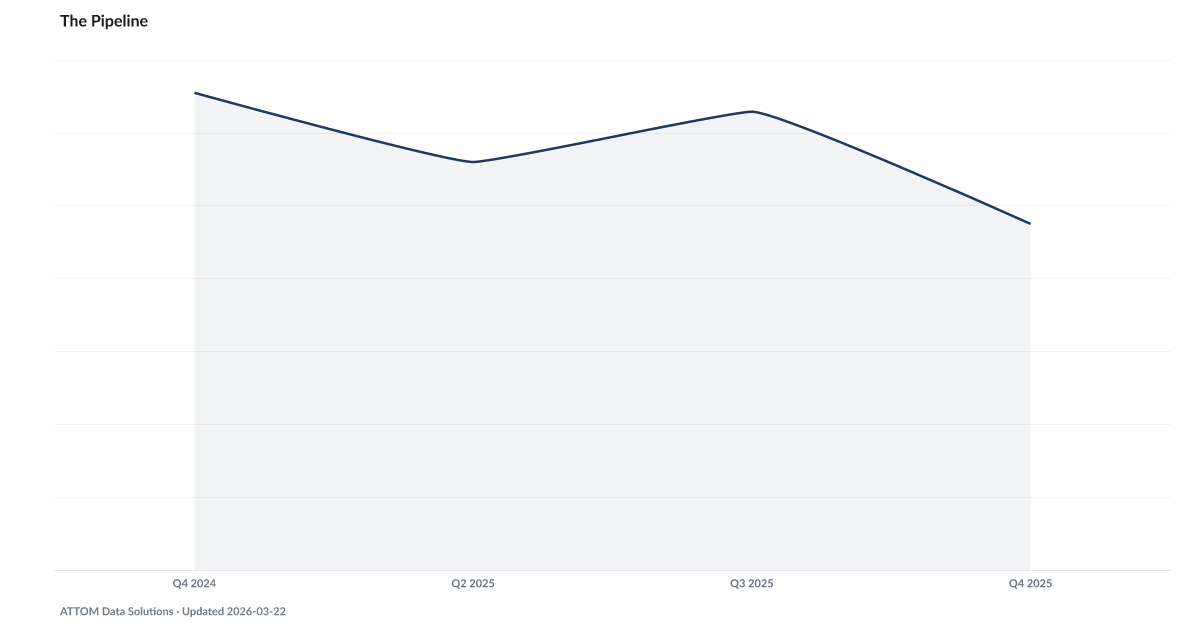 Foreclosure starts versus completions tracks the flow of properties entering the foreclosure process relative to those exiting it through completed sales or bank repossession. When starts exceed completions, the pipeline of distressed properties is growing — a forward-looking signal that more foreclosed inventory will hit the housing market in coming quarters. Source: ATTOM Data Solutions.
