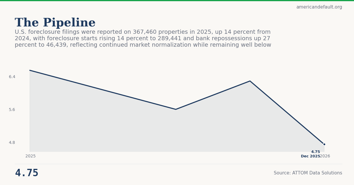 U.S. foreclosure filings were reported on 367,460 properties in 2025, up 14 percent from 2024, with foreclosure starts rising 14 percent to 289,441 and bank repossessions up 27 percent to 46,439, reflecting continued market normalization while remaining well below pre-pandemic levels.