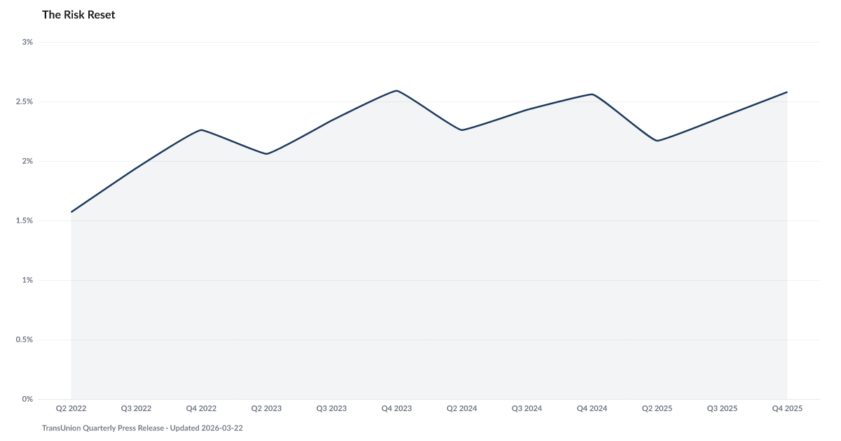 TransUnion reports that subprime originations have shifted as lenders recalibrate risk appetite following pandemic-era credit expansion. This indicator tracks origination patterns among borrowers with credit scores below 620 — the segment most vulnerable to default and most sensitive to changes in lending standards. Source: TransUnion credit data.