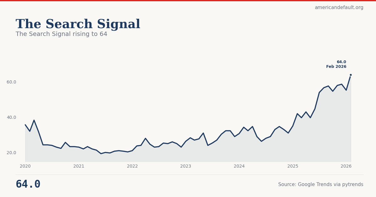 Google Trends provides relative search volume data indexed to a baseline period. American Default tracks a composite of financial distress search terms, normalized and indexed to detect acceleration patterns.