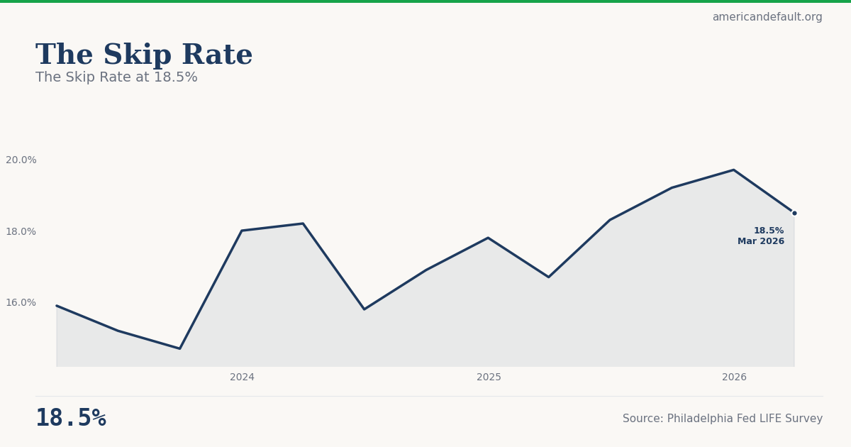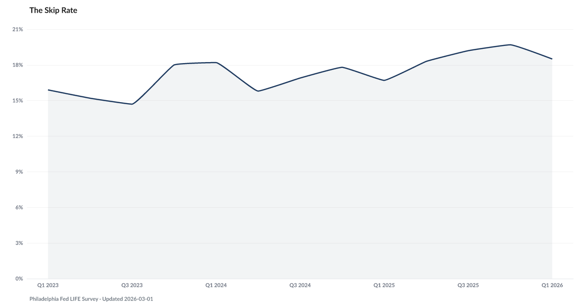 The share of adults skipping bill payments — utilities, medical bills, minimum loan payments — is a behavioral measure of acute financial distress that captures households actively falling behind on obligations in real time. This metric draws from the Philadelphia Fed's Consumer Finance Institute survey data. Source: Philadelphia Fed Consumer Finance Institute.