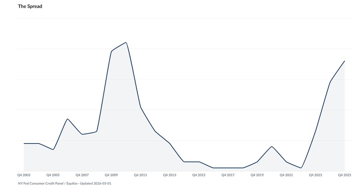 The number of U.S. states where credit card delinquency exceeds 10% is a geographic concentration measure of household debt distress. When delinquency crosses 10% at the state level, it indicates that debt problems have spread beyond individual borrowers to affect the broader regional economy. Source: NY Fed Consumer Credit Panel.