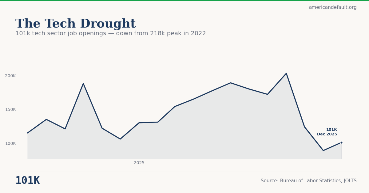 American Default tracks tech openings from BLS JOLTS (Job Openings and Labor Turnover Survey) and Indeed's job posting index, which provides near-real-time data on employer hiring intent.