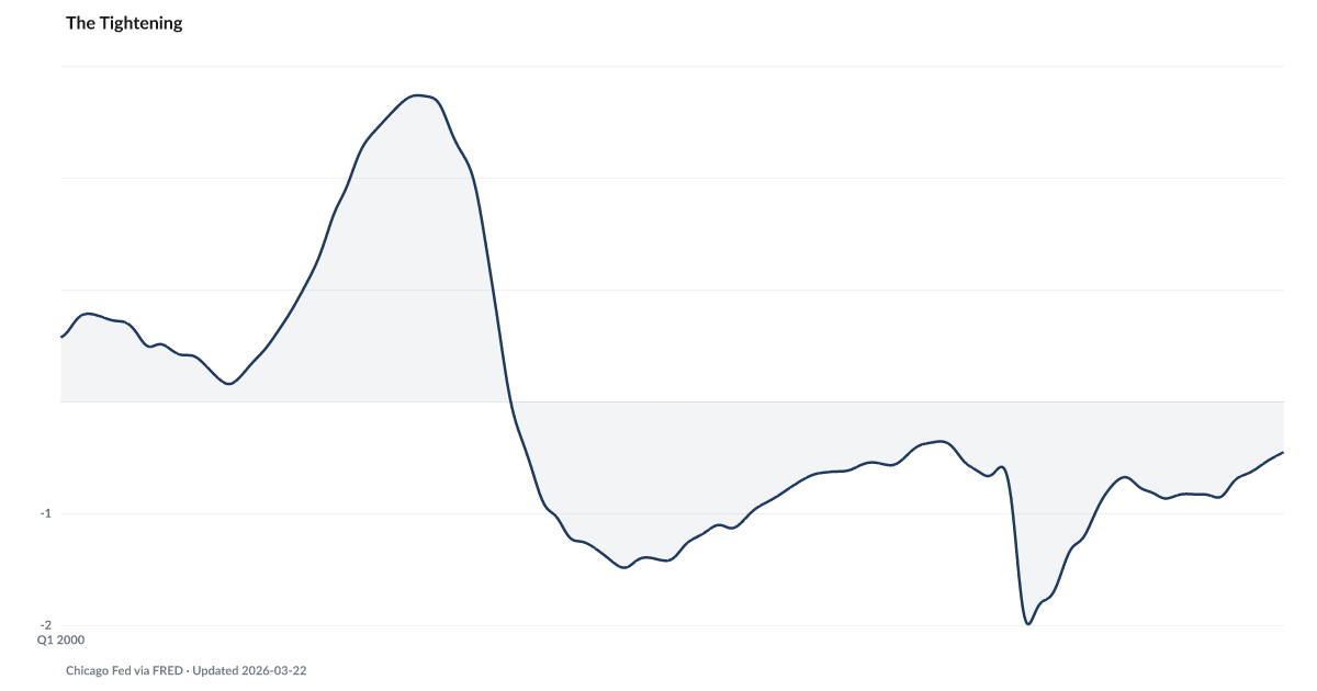 Yes. The index has risen from -0.86 in late 2023 to -0.47 in February 2026 — a nearly 0.4-point move representing the fastest tightening pace since the post-pandemic normalization. While still technically in loose territory, the direction and speed of the move signal that credit is becoming more expensive and harder to access.
