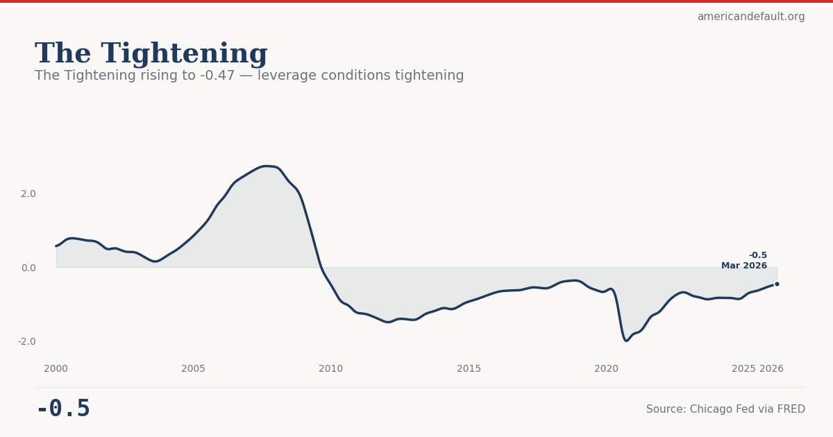 The Chicago Fed's NFCI Non-Financial Leverage Subindex stood at -0.47 in February 2026, up from -0.86 in late 2023. In this index, zero represents average historical conditions and positive values indicate tighter-than-average leverage. The current reading is still negative — meaning conditions are technically looser than the historical average — but the speed and direction of the move matters more than the absolute level. The index has risen nearly 0.4 points since its recent trough, the fastest tightening pace since the post-pandemic normalization.