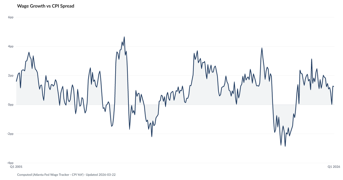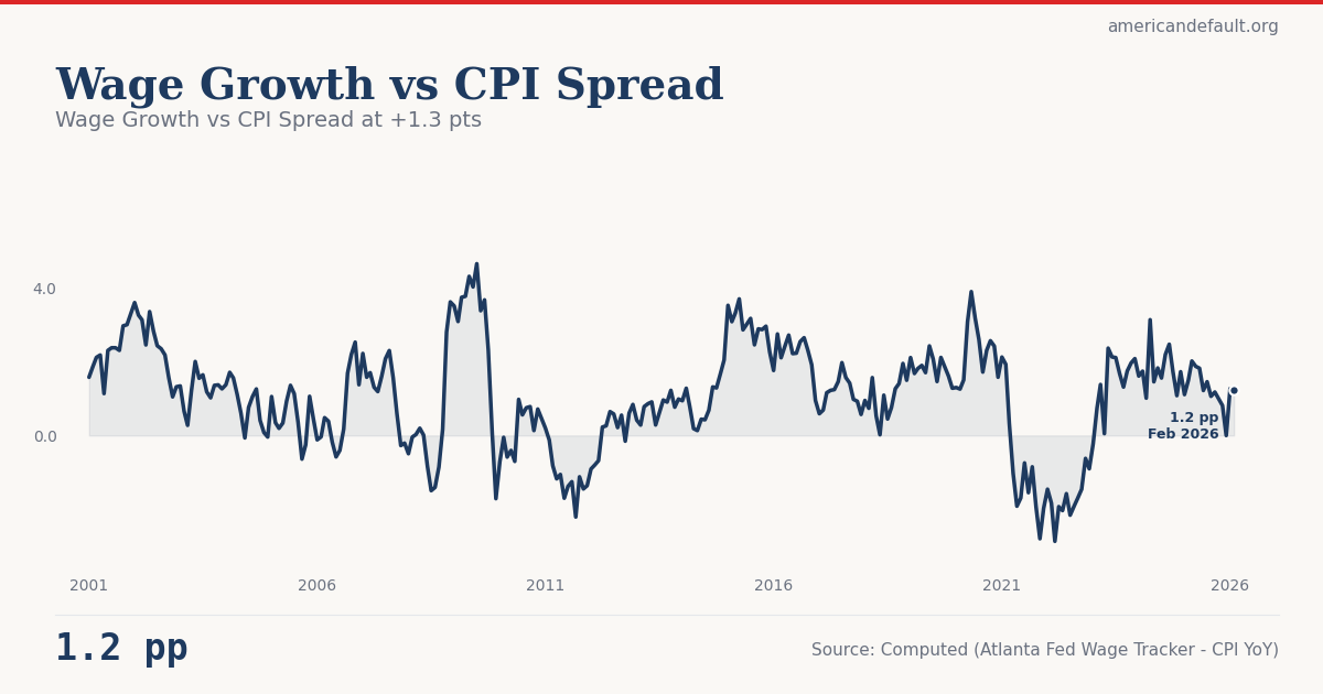 The wage growth vs CPI spread stands at 1.27 percentage points in the latest reading — meaning nominal wage growth exceeds CPI inflation by this margin. When positive, workers are gaining purchasing power. When negative, real wages are falling and households lose ground. This spread is a key component of the Cost Pressure dimension of the American Distress Index. Source: Atlanta Fed Wage Growth Tracker, BLS CPI.